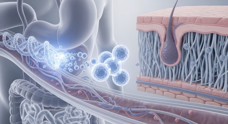Bioavailability is the “invisible gatekeeper” of collagen efficacy, determining whether a supplement actually reaches your cells or simply passes through your system. Because raw collagen is a massive triple-helix molecule (~300,000 Daltons), it must undergo hydrolysis to be snipped into tiny, absorbable peptides (~2,000–5,000 Daltons). This structural downscaling ensures over 90% absorption, allowing these peptides to act as both metabolic building blocks and signaling messengers that trigger your body’s natural production of fresh collagen and elastin.