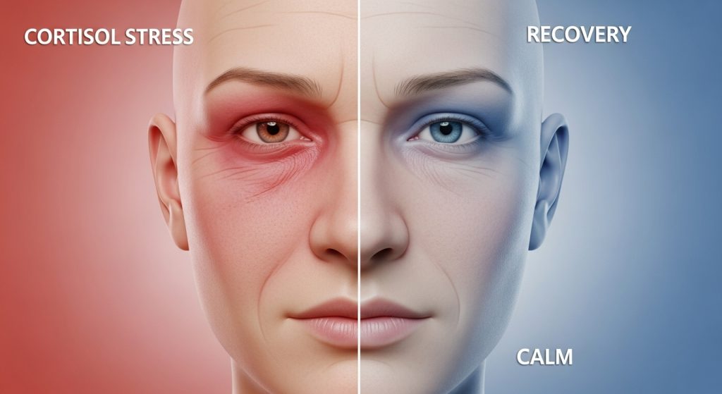 Cortisol plays a central role in the aging process. While it is essential for survival, prolonged elevation damages collagen, disrupts skin repair, and alters fat distribution in the face. Chronic stress also tightens facial muscles, contributing to expression lines that deepen over time.