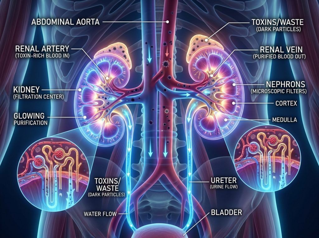 The body naturally removes toxins through organs like the kidneys and liver. Water supports this process by flushing out waste materials.