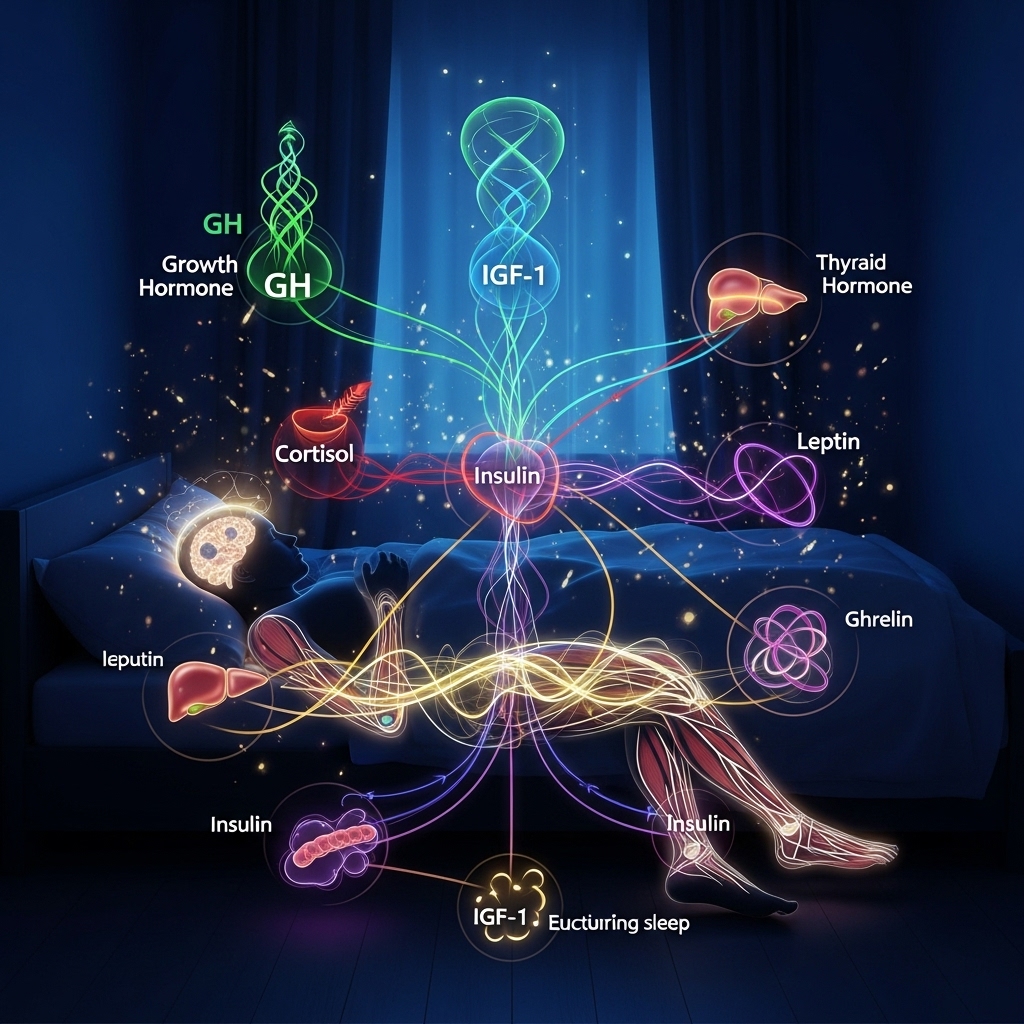Endocrine system: regulates hormones like cortisol, growth hormone, leptin, and ghrelin.